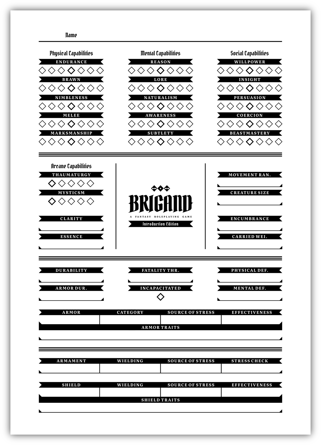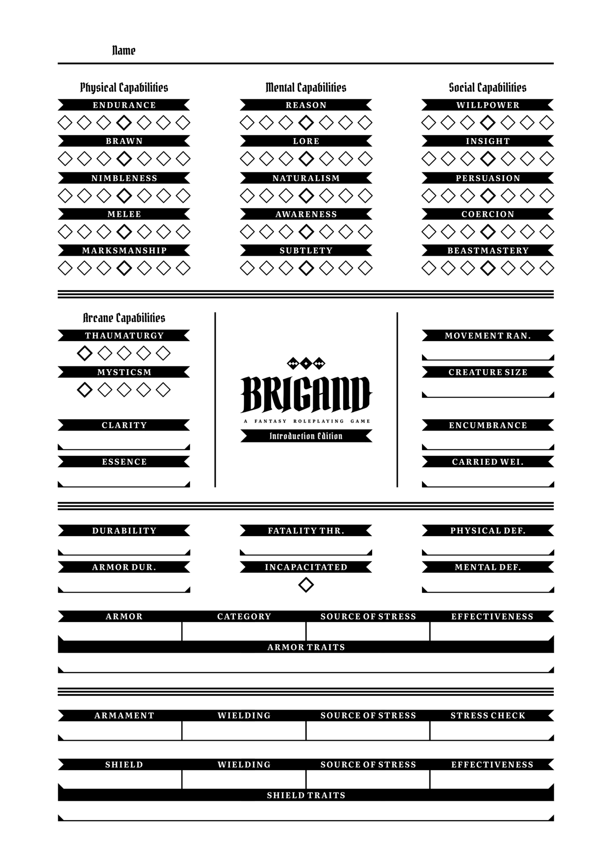 There are no archetypal roles in Brigand. Characters are defined by their capabilities, allowing the players to determine how they function and develop in order to realize a plethora of concepts. These capabilities represent a character’s capacity to perform actions, and each capability includes a specific type of activity.